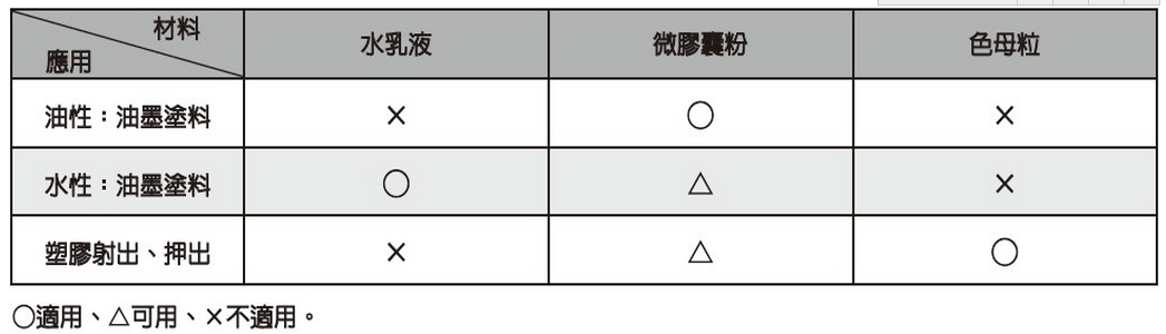 油墨应用时避免高极性溶剂使用如: 甲醇、乙醇、丙酮、丁酮) ,以避免渗透作用影响微胶囊中的组成。