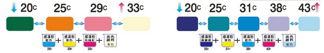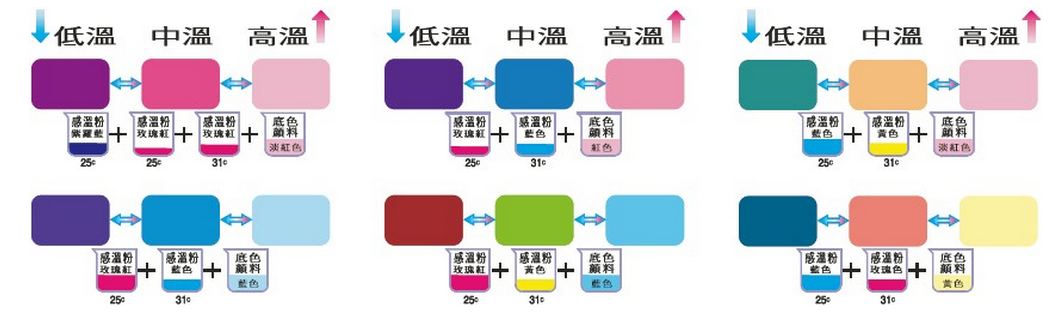 微胶囊包覆著隐形染料、色形成剂及控温剂。藉由不同的控温因子材料选择,可制作出不同的温度区间变色的色料。