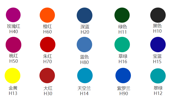 C. 基本颜色:各温度可提供15色(70℃仅提供黑色及深蓝色),各色可互相混合,亦可添加其他色料调色。(以下颜色为印刷色,以实际材料为准,颜色近似于PANTONE色号标示。)